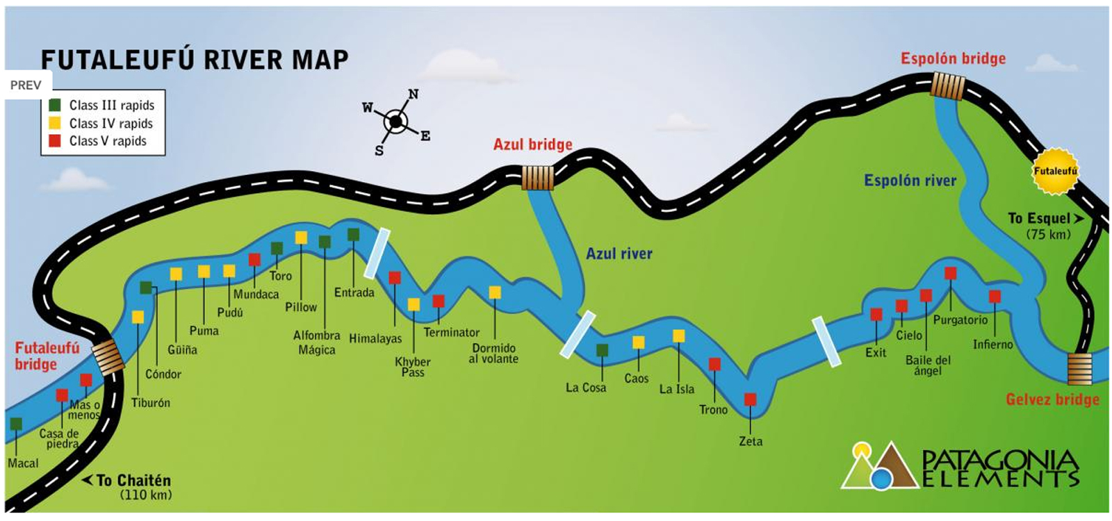 En el extremo norte de la Patagonia chilena, a unos diez kilómetros de la frontera con Argentina encontramos esta maravilla que nos proporciona 20 kilómetros de descenso con una docena de rápidos de clase V (Casa de Piedra, Mundaka, Himalayas, Trono, Exit, Infierno, Terminator…) y otros tantos de clase III y IV con un gran volumen de agua de un insólito color turquesa, de alta transparencia y de agradable temperatura.